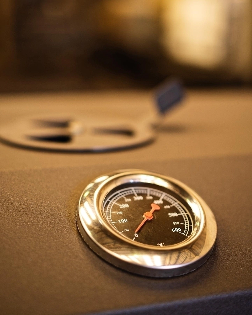 A su vez cuenta con una tapa con pirómetro con el objetivo de regular la temperatura interior de la parrilla.